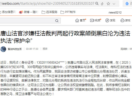 如今,我已就两起案件提起上诉,但李某枉法裁判的违法行为绝不能就此被掩盖。在此,我向社会各界实名曝光李某的违纪违法行径,强烈要求唐山市中级人民法院、河北省高级人民法院、纪检监察机关等相关部门,对李某在(2025)冀0203行初307号、308号两案审理中的枉法裁判、徇私枉法行为进行全面、深入的彻查,依法追究其相应的司法责任和纪律责任,对其涉嫌违法犯罪的行为,移送司法机关处理,坚决清除司法队伍中的害群之马。同时,我要求上级人民法院依法撤销唐山市路北区人民法院作出的两份错误行政判决书,指令异地法院对两案进行重新审理,排除一切干扰,依法公正裁判,还我一个公道,让违法执法的行政机关受到应有的惩处,让司法公正重新焕发光彩!